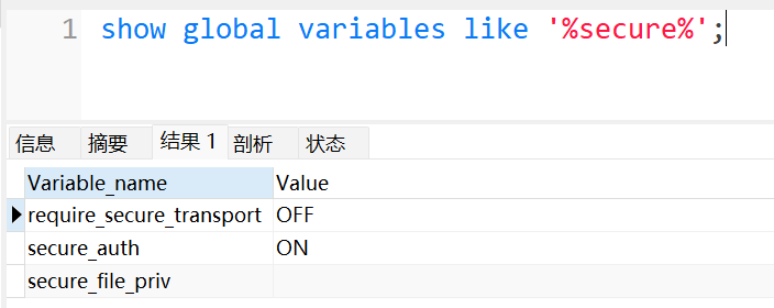 - 查看MySQL是否具有写入权限,当secure_file_priv 返回为空时,证明具有写入权限
